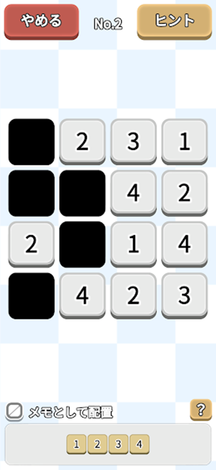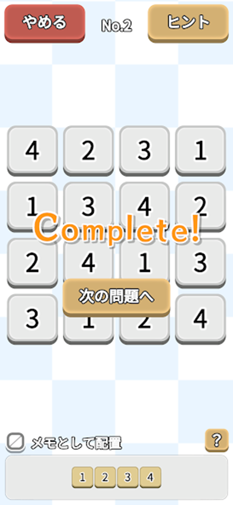 暇つぶしに最適!簡単操作で誰でも楽しめる数独(ナンプレ)アプリ。 初級、中級、上級それぞれ100問、全300問の大ボリューム! さらに日替わりで出題される問題も! スキマ時間で“頭の体操”をはじめましょう。 簡単操作で初心者から上級者まで誰でも楽しめるFitInSudoku! ■リリース日 Android:2025年10月17日日